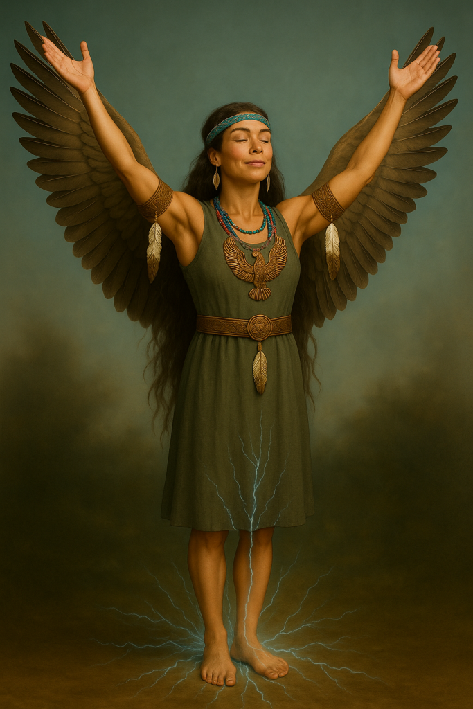 Alors, puisez cette puissance du sol, de la Mère. Cette force coule alors vers le centre de votre être… intégrez-la pour pouvoir ensuite lentement ouvrir vos ailes. Cette puissance monte dans vos bras, votre poitrine, votre gorge, et sentez comment vos bras s’étendent vers le ciel, vous connectant au Ciel, comme je l’ai toujours été. J’avais les pieds ancrés dans la Terre et mes ailes, mes bras, étaient tendus vers le Ciel. Ainsi j’étais, ainsi je suis. Ainsi aussi vous êtes. Alors je vous guide vers cette conscience, cette connaissance en vous, afin que vous la redeveniez, afin de relier le Ciel et la Terre en vous. Car ainsi vous êtes.